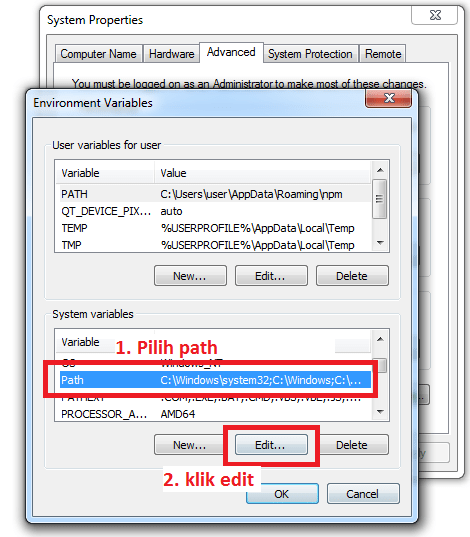 - pilih path pada sistem variable, kemudian klik tombol edit