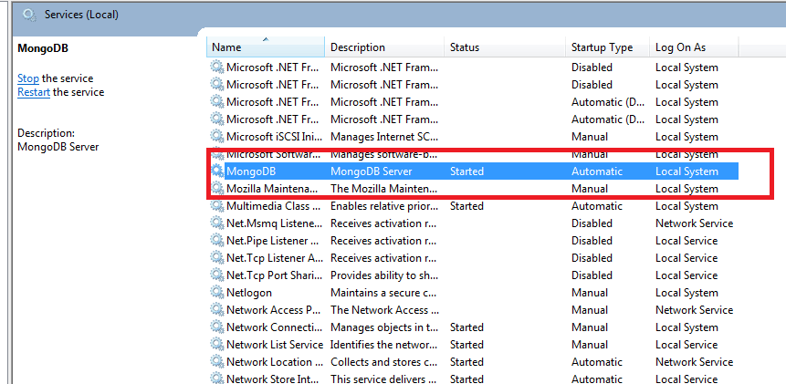 - Services berhasil dijalankan dan jika anda masuk ke system service maka status MongoDB menjadi started