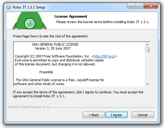Secara otomatis robo 3t menjalankan aplikasi yang sudah diinstal. Pada select box anda pilih I agree dan klik tombol next untuk menyetujui lisensi aplikasi.
