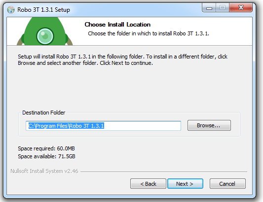 - Kemudian klik tombol next. dan kita akan mengintall robo 3t pada folder default.