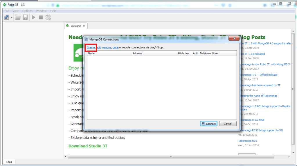 - Untuk terhubung robo 3t dengan database, anda dapat membuat koneksi baru dengan klik menu create.