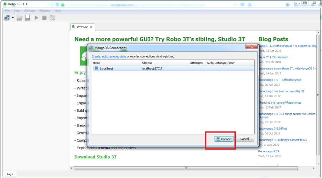 - Koneksi baru terbentuk anda dapat menekan tombol connect. Namun yang perlu anda perhatikan adalah pastikan anda menjalankan mongoDB dan bila anda membuat services pastikan services mongoDB berjalan dengan status running pada komputer anda.