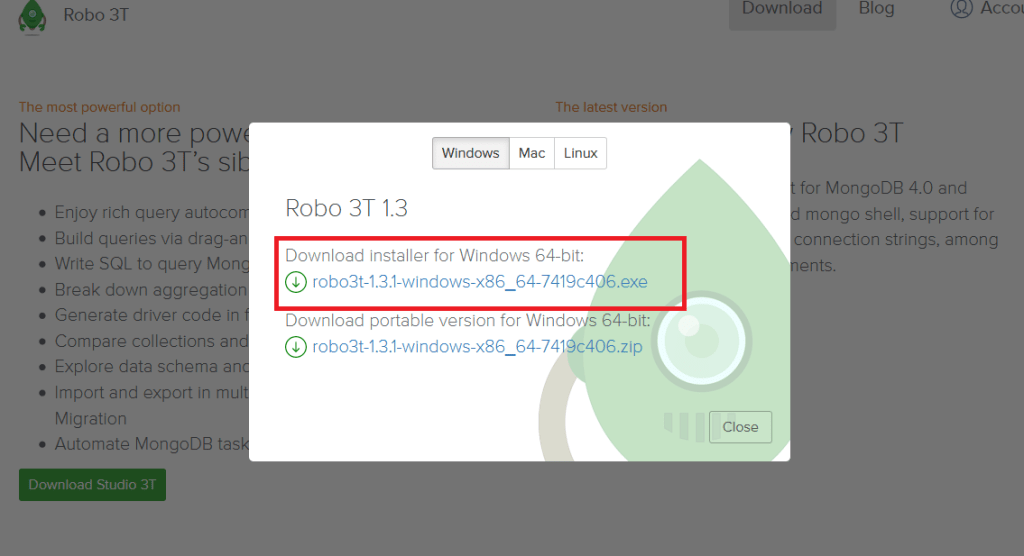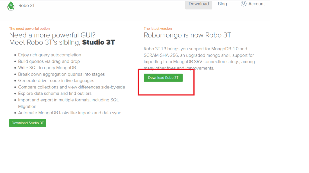 - Download robo 3t pada situs resminya disini. Setelah itu anda pilih download robo 3t. Karena kita hanya memerlukan robo 3t saja.