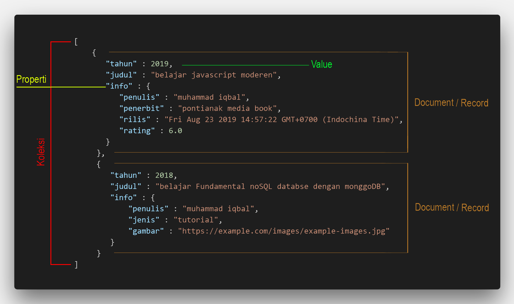 Kita akan membuat suatu analogi agar tidak bingung untuk memahami document dan koleksi pada MongoDB. Karena MongoDB menggunakan konsep model document. Jadi kumpulan beberapa document dalam satu file yang sama dapat dianalogikan layaknya table pada database SQL / relational database. Sedangkan Document sendiri dapat dinyatakan seperti record. Properti dalam objek dapat dinyatakan seperti kolom dan terakhir adalah setiap properti memiliki value mereka masing-masing.